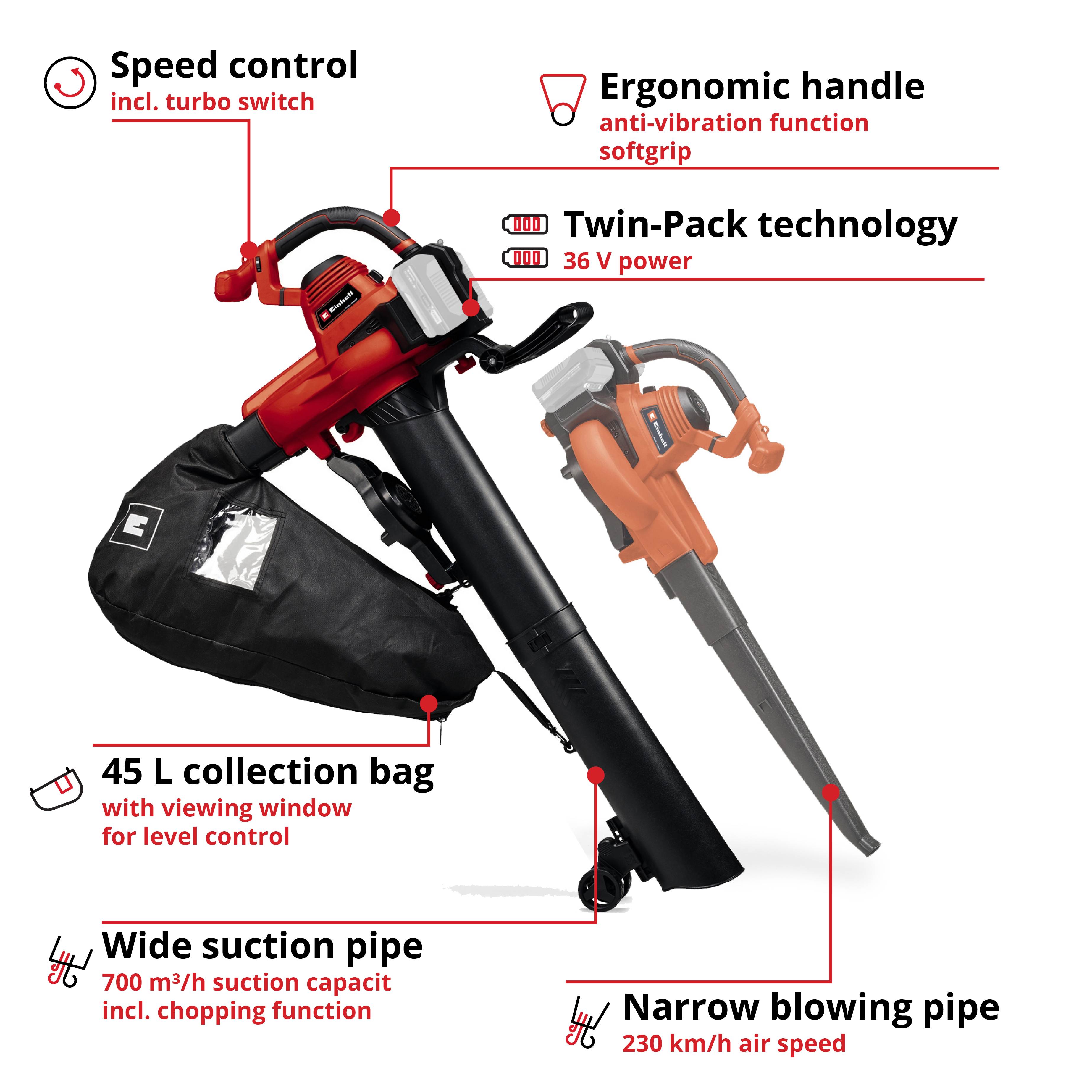 Беспроводной пылесосдля листьев Einhell GE-CL 36/230 Li E-Solo — это небольшой помощник с впечатляющими результатами. Он позволяет легко очистить ваш сад и террасу от листьев, иголок и мелких веток. Листья и другой органический материал следует убирать не только по эстетическим соображениям — нельзя недооценивать риск поскользнуться на дорожках, на террасе или в саду, особенно в сырые осенние и весенние дни. Как член семейства Power X-Change, беспроводной пылесосдля листьев предлагает полную гибкость высокопроизводительного беспроводного семейства: любой Аккумулятор PXC можно комбинировать с любым системным устройством. Для работы требуются 2 батареи по 18 В. Они доступны отдельно, например, в качестве практичного стартового комплекта. Преобразование из широкой всасывающей трубы в узкую выдувную трубу — обе входят в комплект поставки — выполняется без инструментов. Встроенный турбопереключатель обеспечивает максимальную мощность выдува. Мощность контролируется электронным регулятором скорости. Эргономичная ручка с мягкой накладкой и функцией антивибрации, регулируемая дополнительная ручка и регулируемый ремень для переноски делают работу с беспроводным пылесосом для листьев особенно комфортной. Два направляющих колеса также регулируются по высоте. Отверстие для очистки оснащено предохранительным выключателем. Беспроводной пылесосдля листьев имеет 45-литровый мешок для сбора со смотровым окном для контроля уровня.