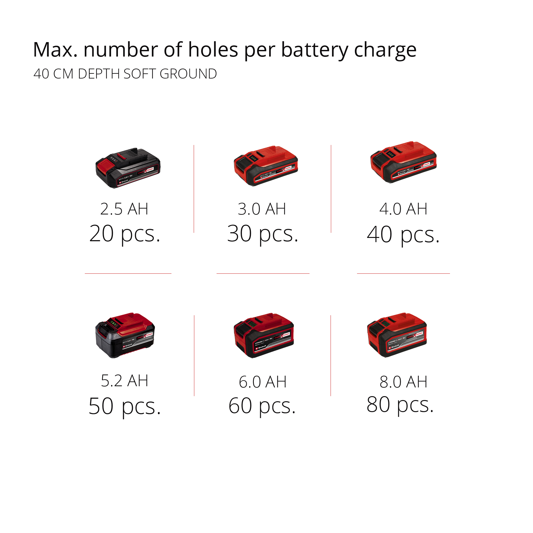 Макс. количество отверстий глубиной 40 см на одном заряде Аккумуляторный улятора - мягкий грунт (2,6 Ач)