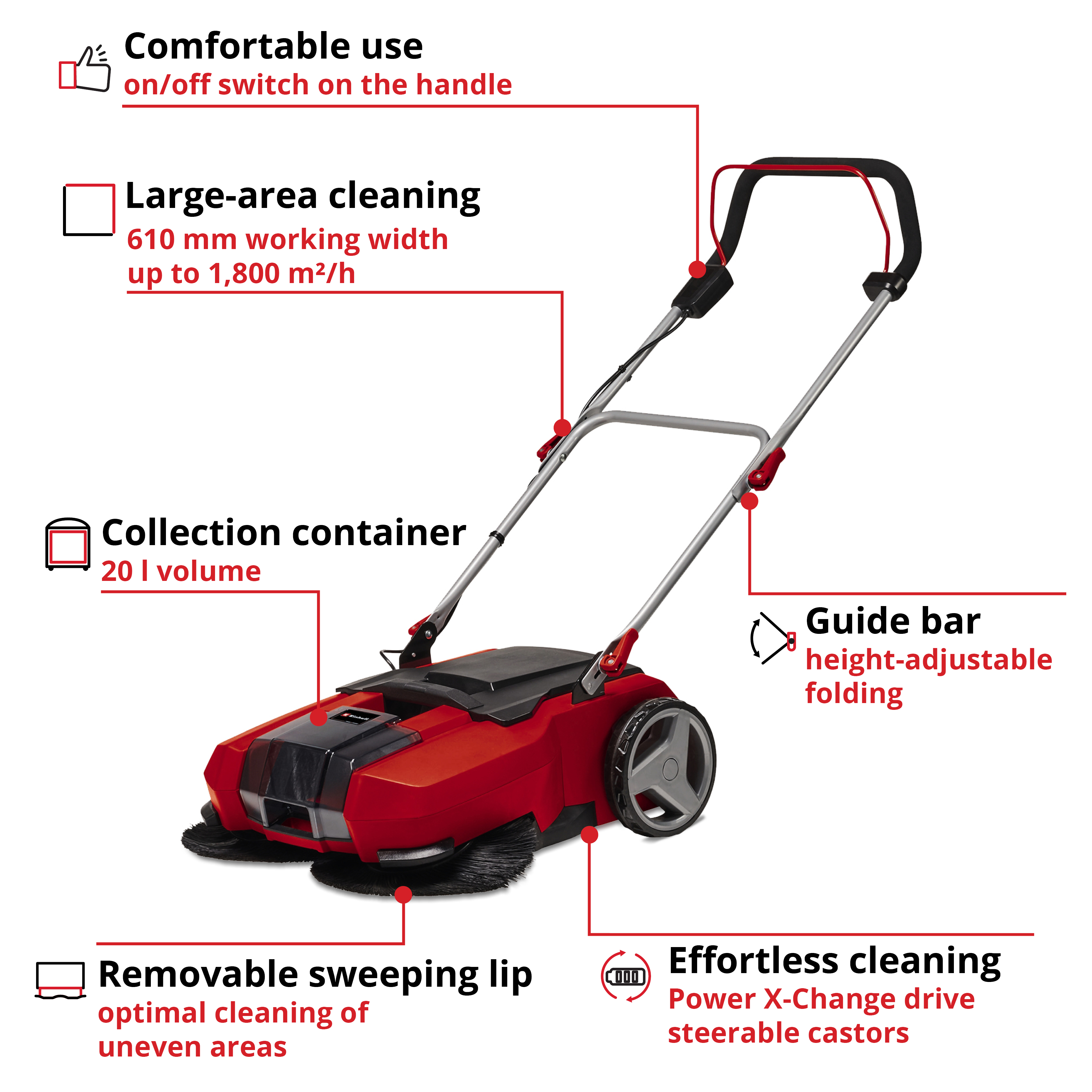Беспроводная механическая подметальная машина Einhell TE-SW 18/610 Li-Solo является членом гибкого семейства PXC. Аккумулятор и зарядное устройство доступны отдельно. Для беспроводной машины требуется одна Аккумуляторная батарея 18 В. Механическая подметальная машина помогает в подметании, позволяя вам подметать без напряжения и усилий с помощью привода щетки с Аккумуляторным питанием, вплоть до краев благодаря щеткам, расположенным сбоку. Специально для подметания больших площадей со скоростью до 1800 м² в час благодаря ширине подметания 610 мм, он легко справляется с поддержанием порядка на больших дворах. Переключатель Вкл/Выкл расположен на самой ручке. Для удобства использования он имеет большие поворотные ролики и эргономичную форму. В комплекте с 20-литровым баком для грязи, который можно поставить.