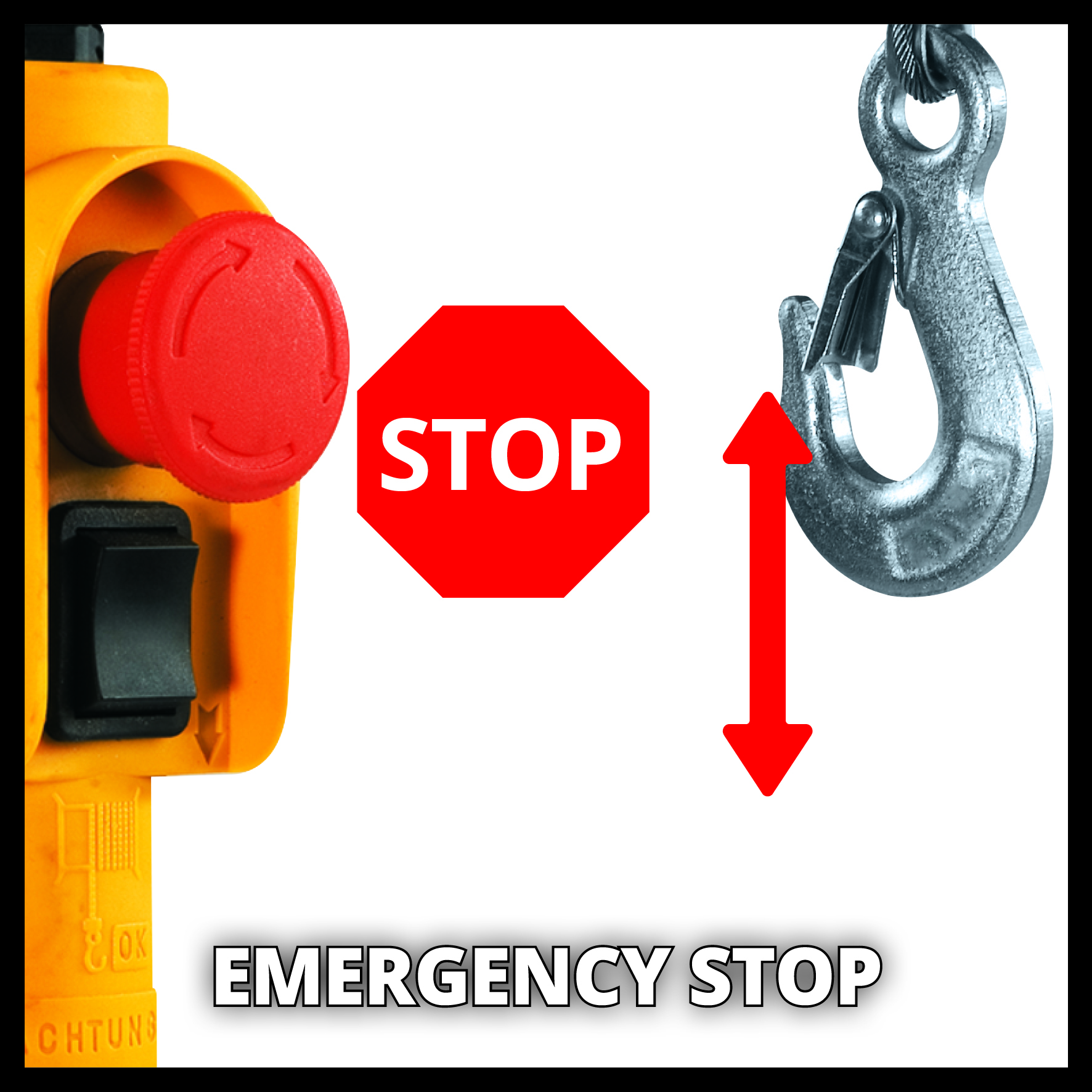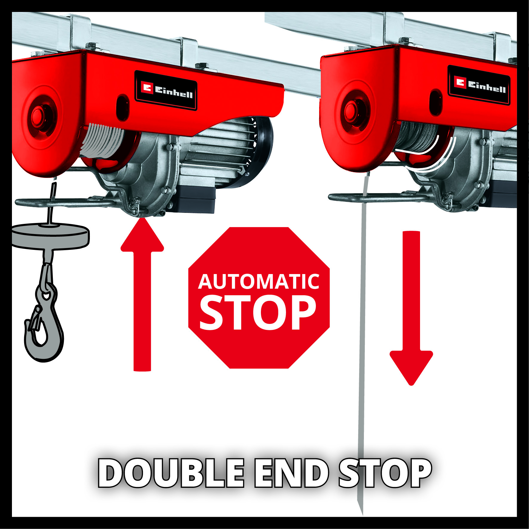 Тросовая лебедка Einhell TC-EH 500 позволяет удобно и с минимальным напряжением поднимать тяжелые грузы. При использовании без направляющего ролика тросовая лебедка может поднимать грузы весом до 250 кг на высоту до 11,5 м одним нажатием кнопки. При использовании с направляющим роликом нагрузка увеличивается до 500 кг, а высота подъема уменьшается вдвое до 5,7 метров. Тросовая лебедка оснащена двенадцатиметровым тросом без перекручивания (Ø 4,0 мм) для подъема. Комплексные функции безопасности включают аварийную остановку, термостатический выключатель для защиты двигателя от перегрева, автоматический концевой выключатель и предохранительный фиксатор на грузовом крюке для предотвращения непреднамеренного падения груза. Автоматический тормоз фиксирует груз в любом положении. Для крепления тросовой лебедки предусмотрены два двойных зажима.